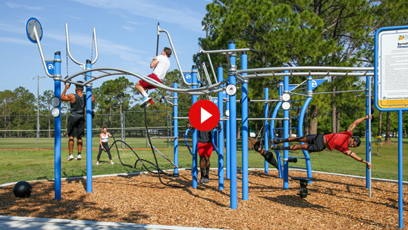 Situated in beautiful Orange County, FL, this 27-person rig was specially designed to maximize the available space. Featuring 22 challenging components and a bright blue custom color, the Barnett Park gym brings a unique workout space to the community.